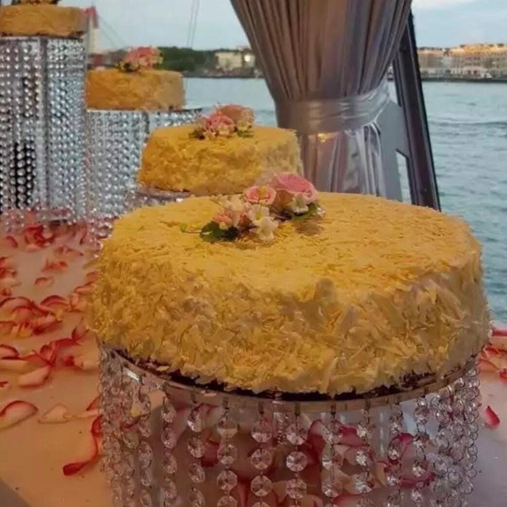 Introducing our stunning Cascading Chandelier Crystal Cake Stand, available with either acrylic or glass crystals to suit your style. Choose from three elegant styles: 3-tier, 4-tier, or 5-tier, with customization options available.