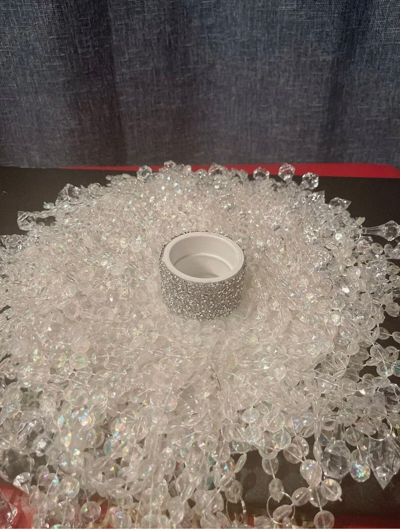 This cake stand is 8inches in height, durable and strong for ant event. Made with PVC, acrylic and crystal beads. Easy to set up and take apart. This cake stand will ship flat, it will arrive in 3 parts, the chandelier top, the 8inch pole and the base plate. This cake stand is available in sizes from 6in to 18in . The decorative mesh on the pole and crystal top will be silver. For customization, please send a message.