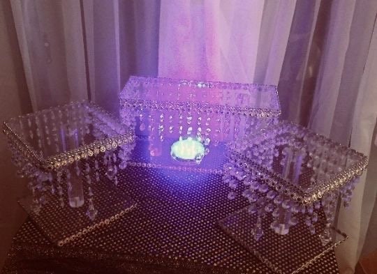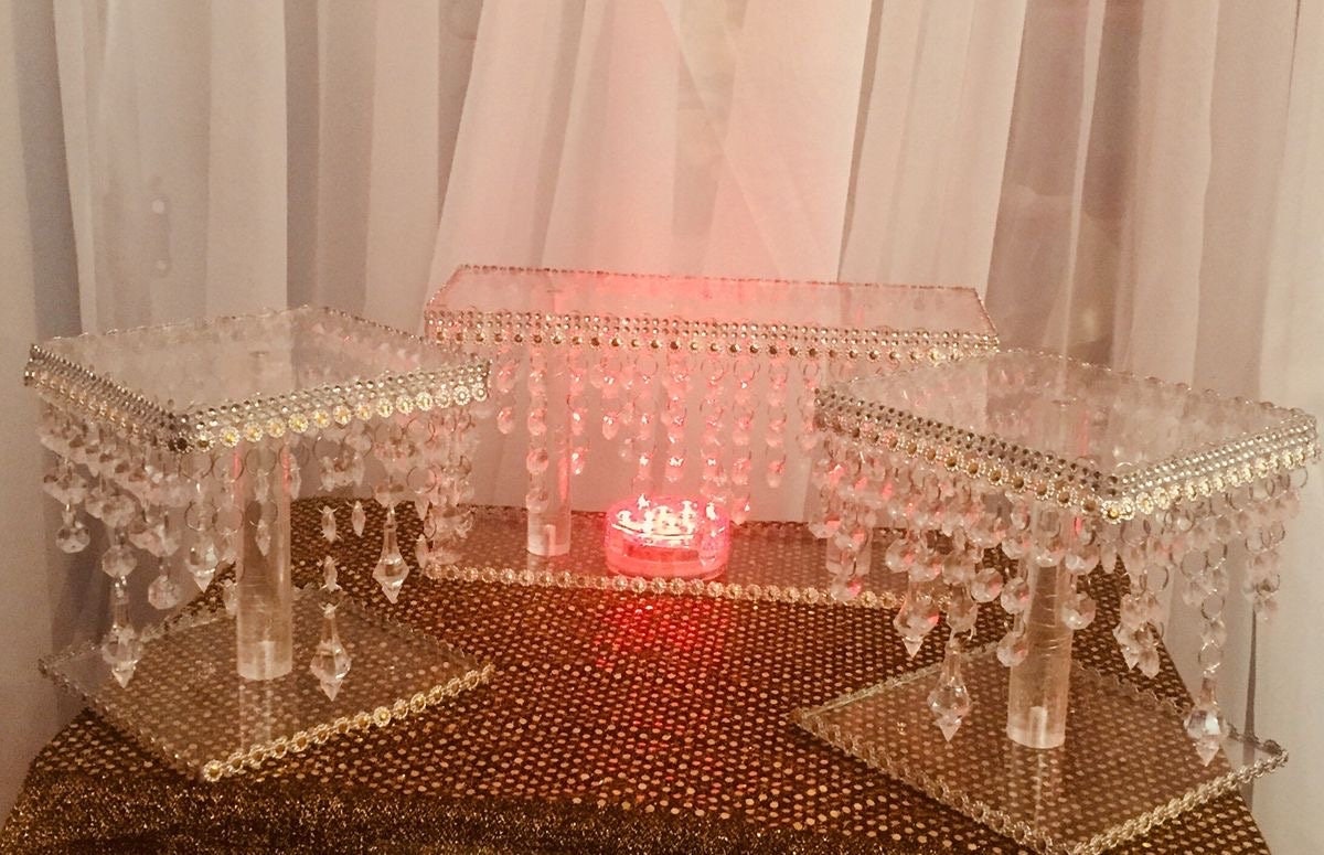 - Two 5-inch stands with a 4-inch height, adorned with elegant hanging crystals