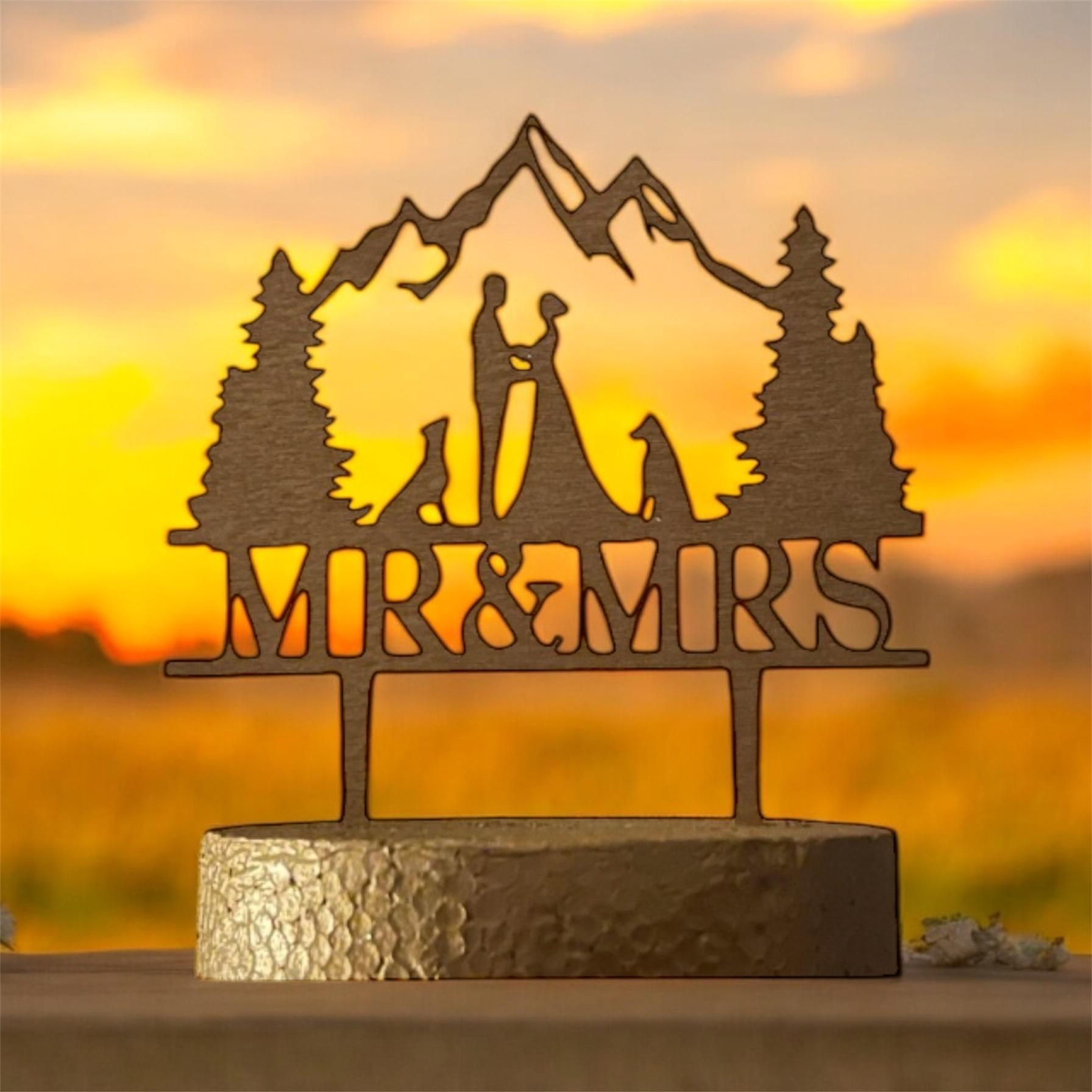 Personalized Wedding Cake Topper Rustic Mountain Cake Topper Custom Silhouette Couple with Dog | Bride and Groom Cake Topper Anniversary